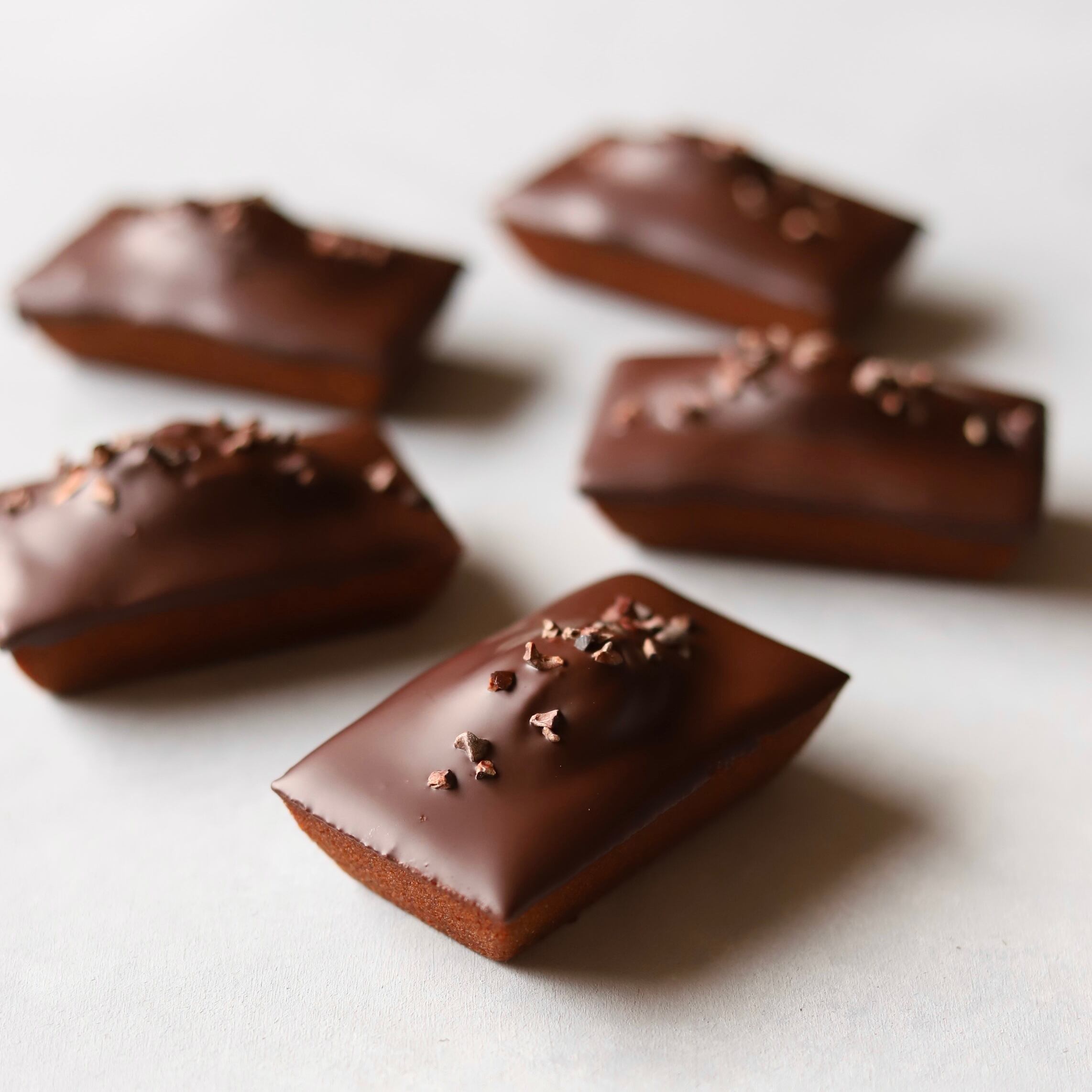 小麦粉を最小限に抑え、アーモンドプードルと上質なカカオを贅沢に練り込んだ濃厚なフィナンシェ生地。その上から、ショコラティエ厳選のチョコレートを丁寧にコーティングしました。